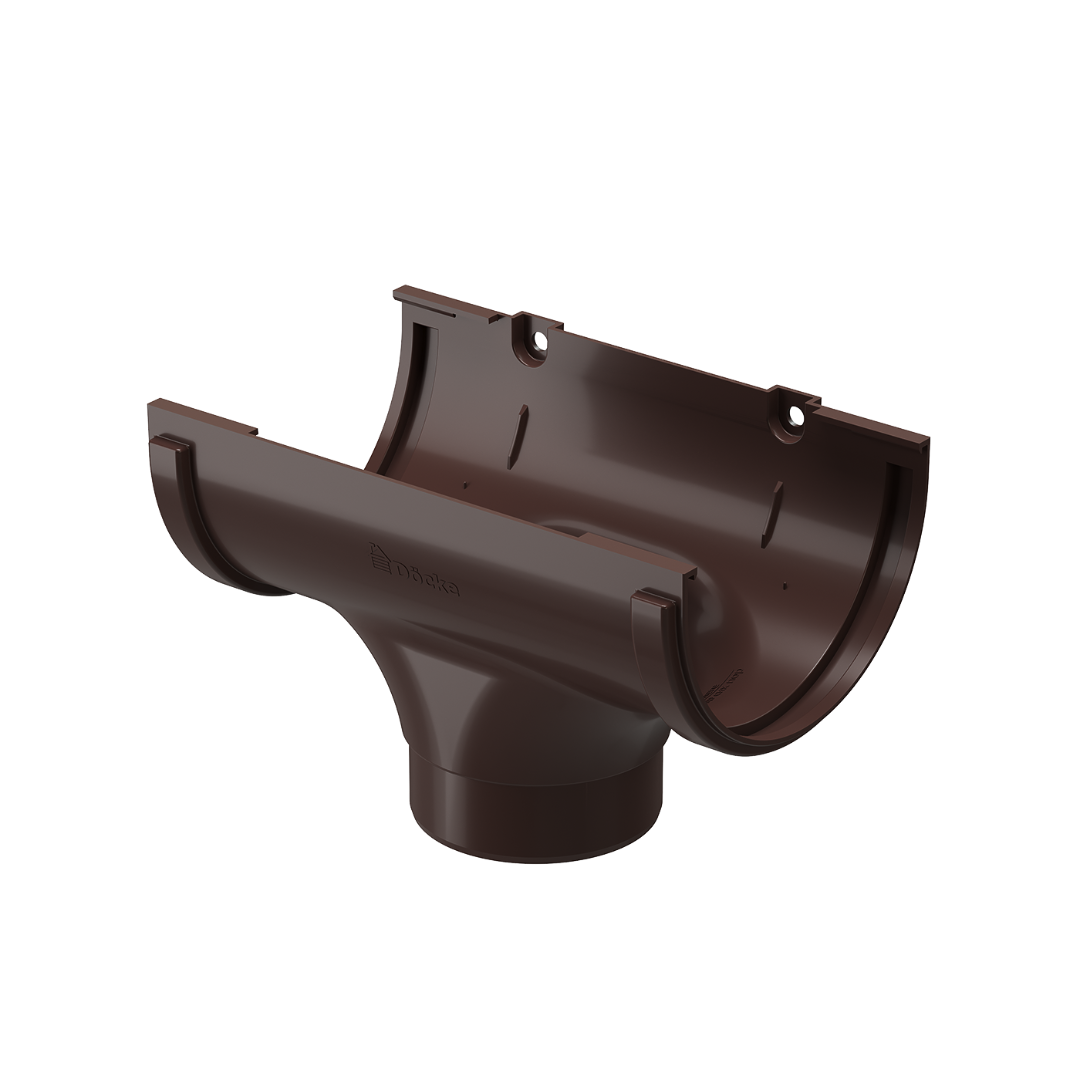 Темно-коричневая водосточная воронка из серии «Standard» идеально сочетается по форме, размеру и цвету с остальными элементами. Служит для отведения воды из желоба в трубу.